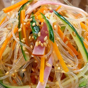 glass noodle, cucumber, carrot, chicken/ pork, sesame