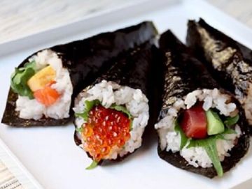 salmon, avocado, egg, cucumber tuna, imitation crab meat, lettuce, corn
